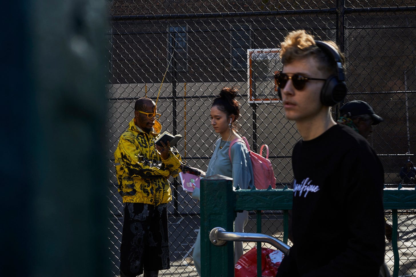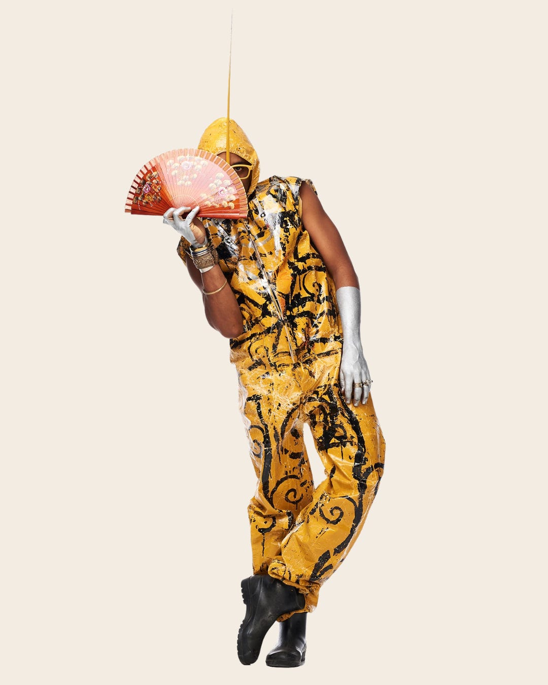 He takes thrifted clothes and reconstructs them into garments that protect, transform, and announce. Not costumes — armors for bodies that need to move through the world differently.