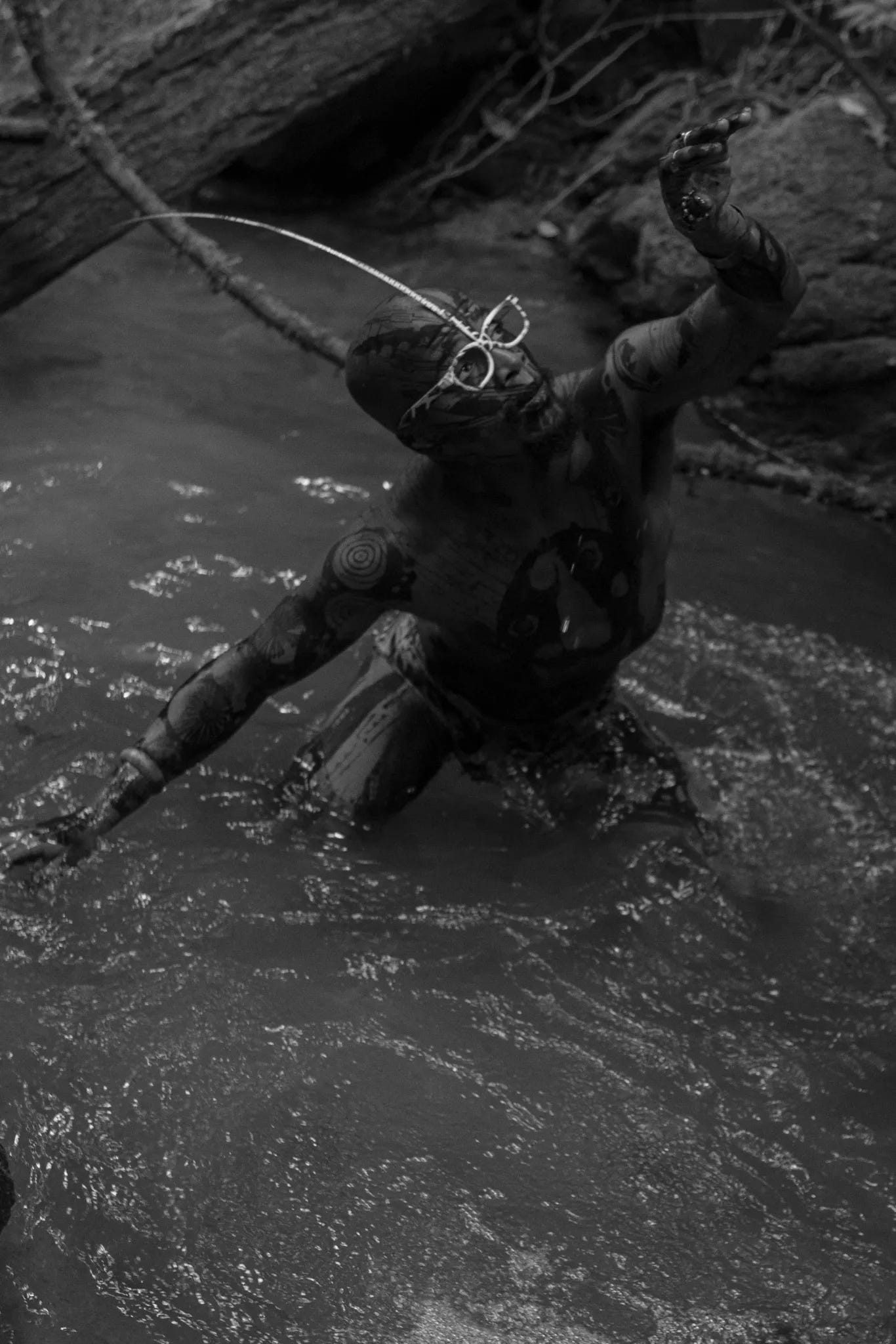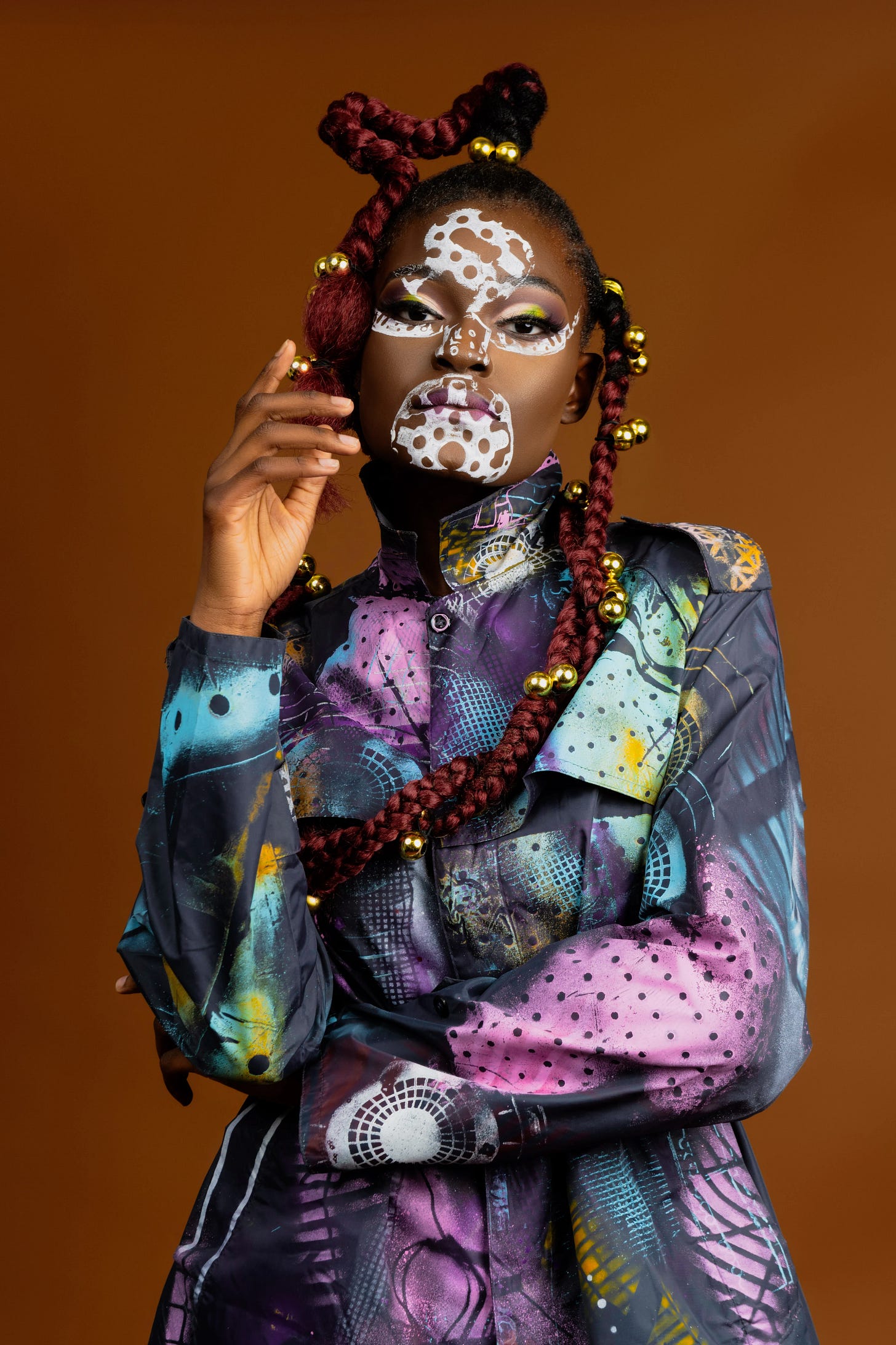 Dance, present in his life since age 10, is the root system beneath everything else. Movement is ritual and medicine — a way to purify, liberate, and connect. He often carries this into his performances and artistic processes: the brushstroke has choreography; the armor has choreography.